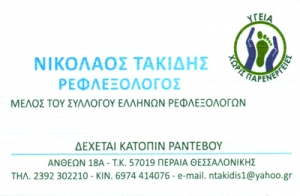 Το ανθρώπινο σώμα μέσω των νευρικών απολήξεων αποτελεί την ελπίδα μας για πρόληψη και ανακούφιση από χρόνιες ασθένειες στο φυσικό σώμα. Ψυχασθένειες, η μάστιγα των επόμενων δεκαετιών. Φροντίστε το σώμα σας, τόσο εκ των έσω, ψυχικά, όσο και εξωτερικά (ΠΟΝΟΣ) και απευθυνθείτε στην Ρεφλεξολογία.