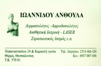 Λέξεις κλειδιά: δερματολογος αφροδισιολογος ιωαννιδου ανθουλα ανθη, δερματολόγοι θερμη θεσσαλονικη αφροδισιολόγοι, dermatologos afrodisiologos ioannidou anthoula iwannidou an8oula anuoyla ivannidou thermi thessaloniki 8ermi 8essaloniki uermi dermatologoi afrodisiologoi, δερματολογος θερμη, δερματολογος θεσσαλονικη, αφροδισιολογος θερμη, αφροδισιολογος θεσσαλονικη, εγκαύματα, έγκαυμα, αφροδίσια, νόσημα, νοσήματα, αφροδίσιο, καυτηριασμός, κονδηλώματα, κονδυλώματα, κονδιλώματα, κονδηλόματα, κονδυλόματα, κονδιλόματα, παθήσεις δέρματος (ακμή, ατοπική δερματίτιδα – έκζεμα, ακτινικές υπερκερατώσεις, μυρμηγκιές, θηλώματα, αιμαγγειώματα, υπεριδρωσία, καρκίνοι δέρματος, ψωρίαση, λεύκη κλπ), παθήσεις ονύχων (ονυχομυκητίαση), παθήσεις τριχών (ανδρογενετική αλωπεκία, διάχυτη αλωπεκία, γυροειδής αλωπεκία, κλπ) και σεξουαλικά μεταδιδόμενα νοσήματα (κονδυλώματα, έρπητας γεννητικών οργάνων, σύφιλη, βλεννόρροια, μαλακό έλκος, χλαμύδια κλπ), θεραπεία ευρυαγγειών και αιμαγγειωμάτων, στην αποκατάσταση ουλών, στην ανάπλαση δέρματος, σε ραγάδες – ραβδώσεις , και σε μελαγχρωματικές καφέ κηλίδες, επανορθωτικές και αναπλαστικές θεραπείες ( laser ανάπλασης, εμφυτεύματα υαλουρονικού οξέος, botox, peeling, μεσοθεραπεία κυτταρίτιδας, μεσοθεραπεία τριχόπτωσης, θεραπεία υπεριδρωσίας)